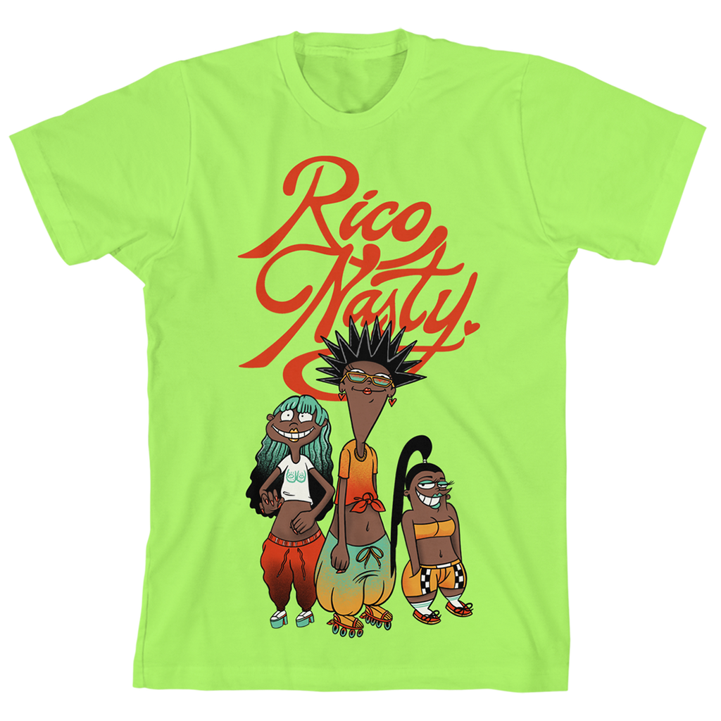 The Rico Nasty ‘Ricco Riccy T-shirt’ features a cartoon graphic printed on the front of a green unisex t-shirt.Share